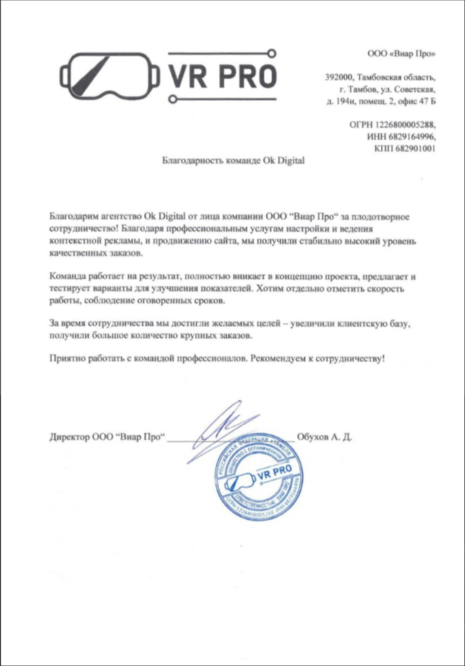 Благодарим агентство OK Digital от лица компании ООО «Виар Про» за плодотворное сотрудничество! Благодаря профессиональным услугам по настройке и ведению контекстной рекламы, и продвижению сайта, мы получили стабильно высокий уровень качественных заказов.