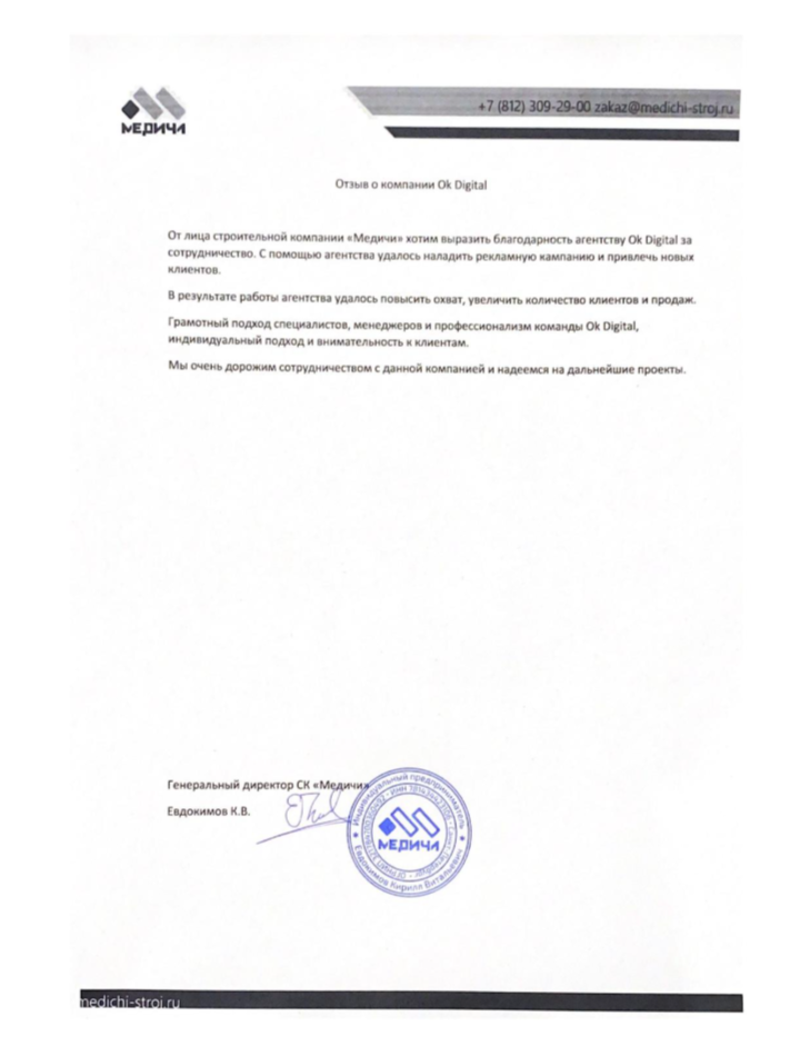 От лица строительной компании «Медичи» хотим выразить благодарность агентству OK Digital за сотрудничество. С помощью агентства удалось наладить рекламную кампанию и привлечь новых клиентов.
