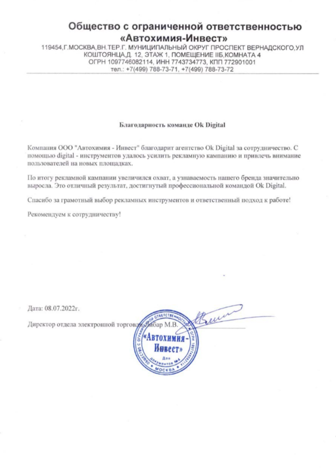 Компания ООО «МТОРТ» благодарит агентство OK Digital за сотрудничество. С помощью digital-инструментов удалось усилить рекламную кампанию и привлечь внимание пользователей на новых площадках.