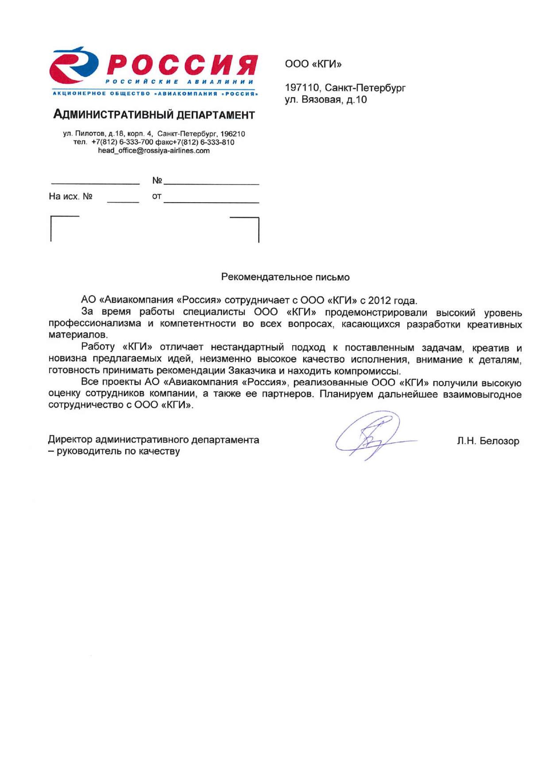 Л.Н. Белозор - директор административного департамента - руководитель по качеству АО "Авиакомпания "Россия"