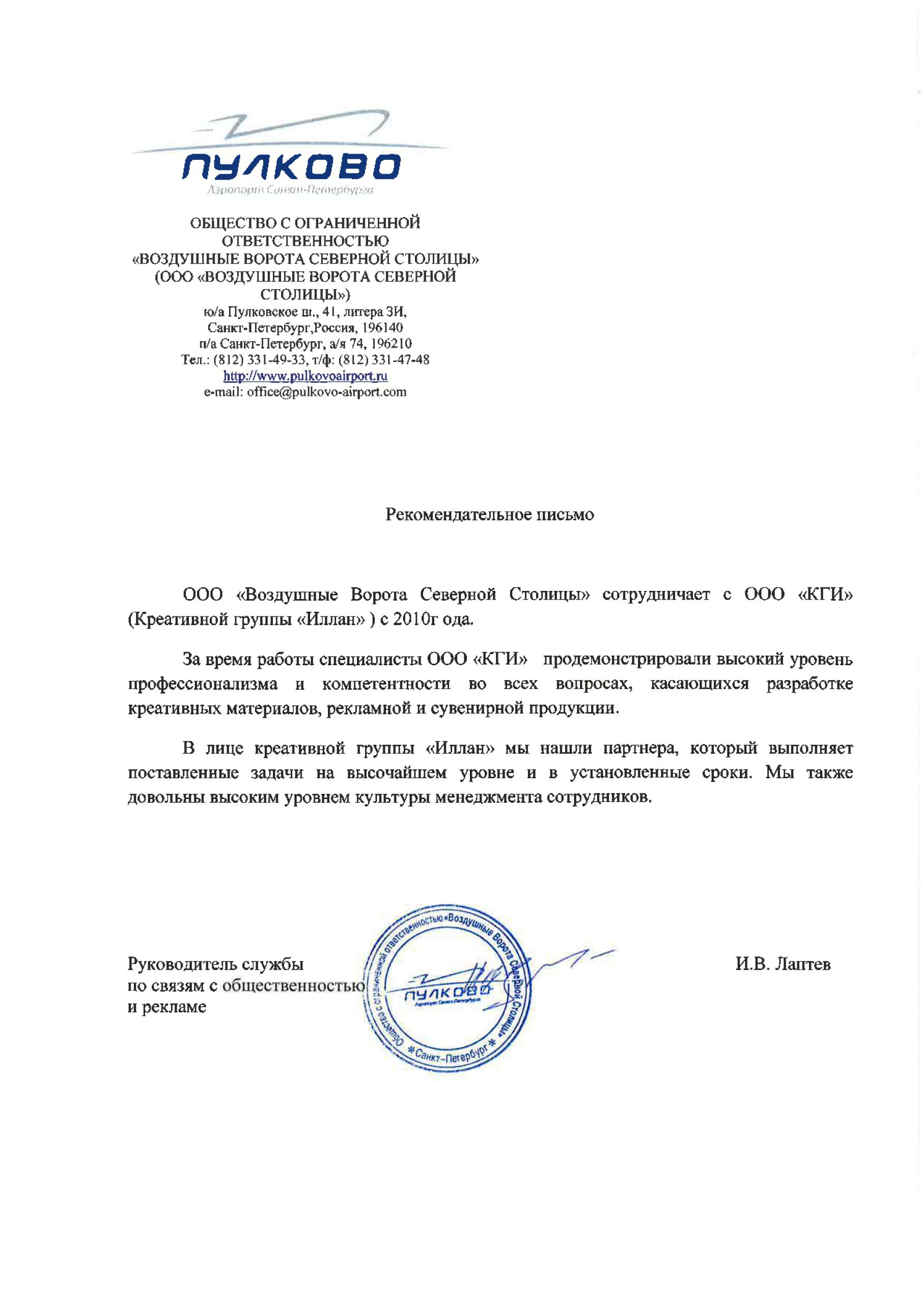 И.В. Лаптев - руководитель службы по связям с общественностью и рекламе ООО "ВОЗДУШНЫЕ ВОРОТА СЕВЕРНОЙ СТОЛИЦЫ"