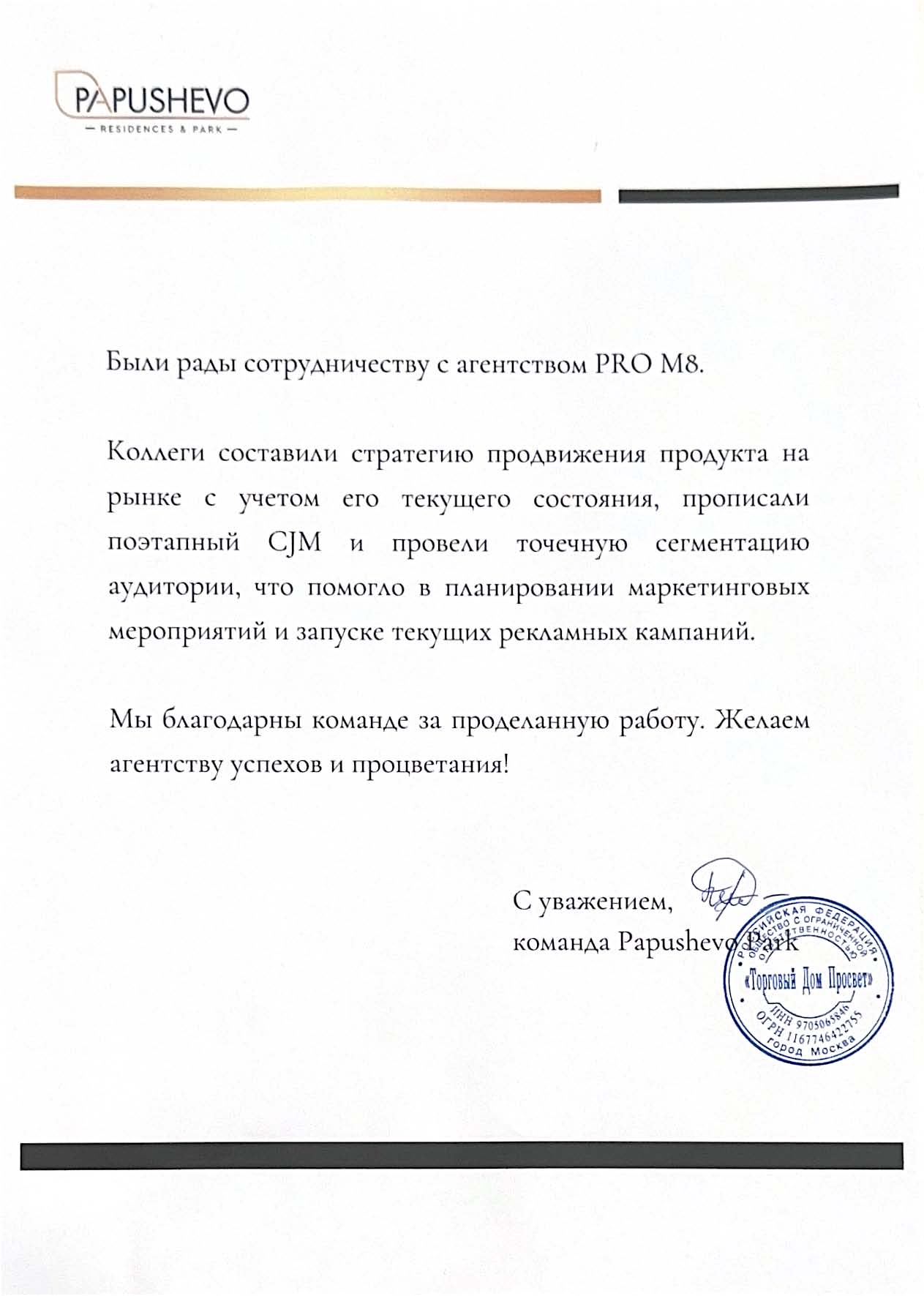 Благодарю команду агентства Pro M8 за легкий и безболезненный для бизнеса ребрендинг нашей компании. Оригинальная маркетинговая стратегия позволила быстро ввести новый бренд в клиентскую среду и запустить рекламную компанию на максимальных оборотах. Эффективно, экономно, профессионально