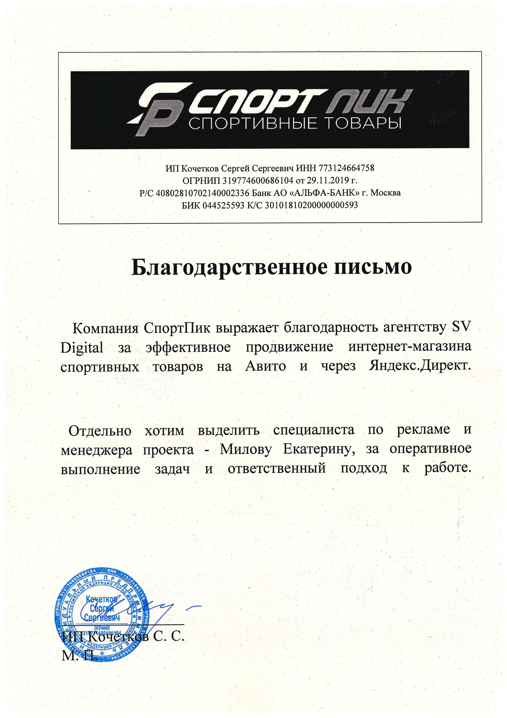 Компания СпортПик выражает благодарность агентству SV Digital за эффективное продвижение интернет-магазина спортивных товаров на Авито и через Яндекс.Директ.