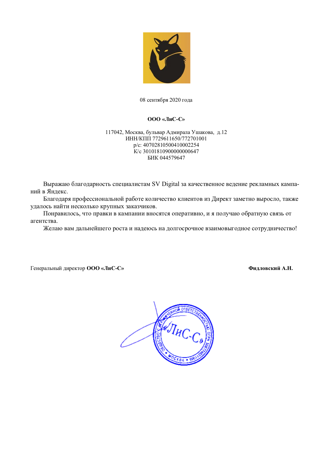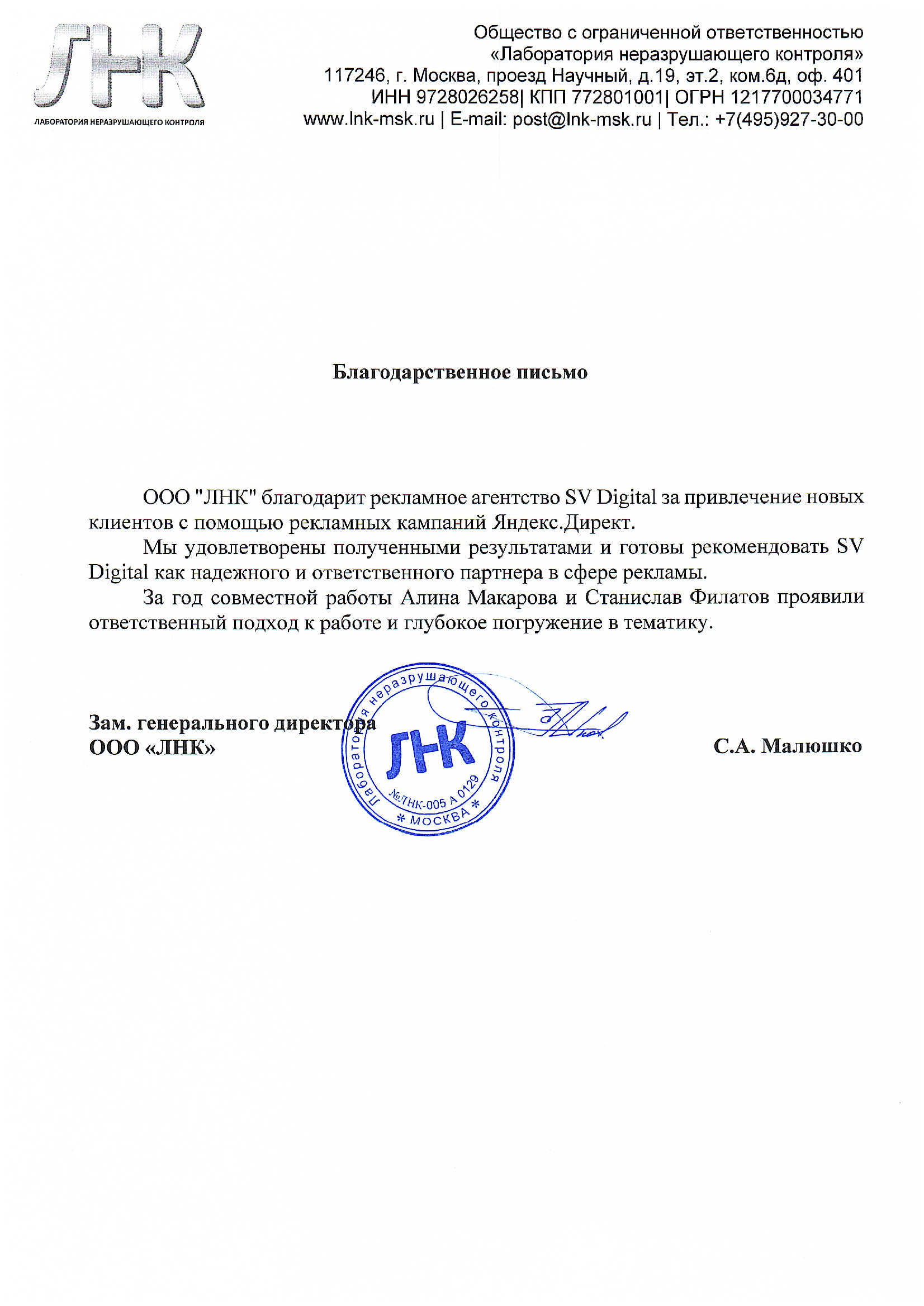 ООО «ЛНК» благодарит рекламное агентство SV Digital за привлечение новых клиентов с помощью рекламных кампаний Яндекс.Директ.