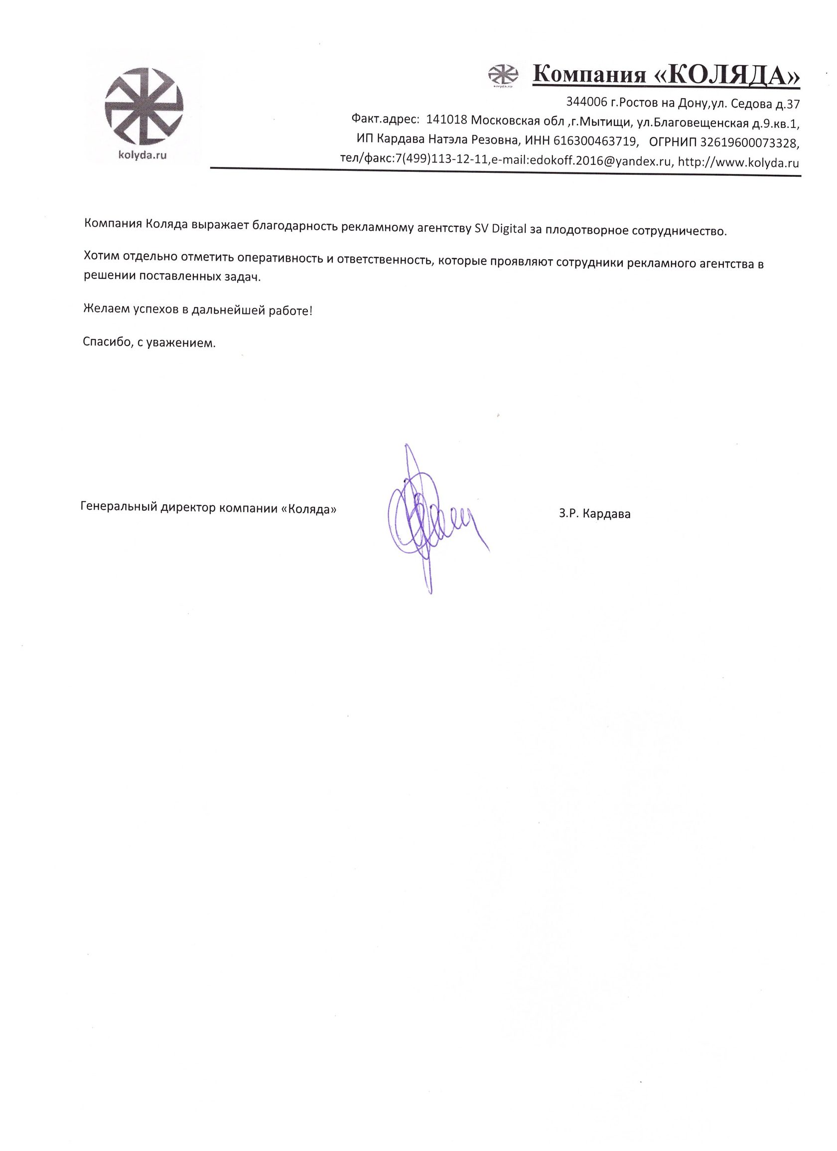 Компания Коляда выражает благодарность рекламному агентству SV Digital за плодотворное сотрудничество.