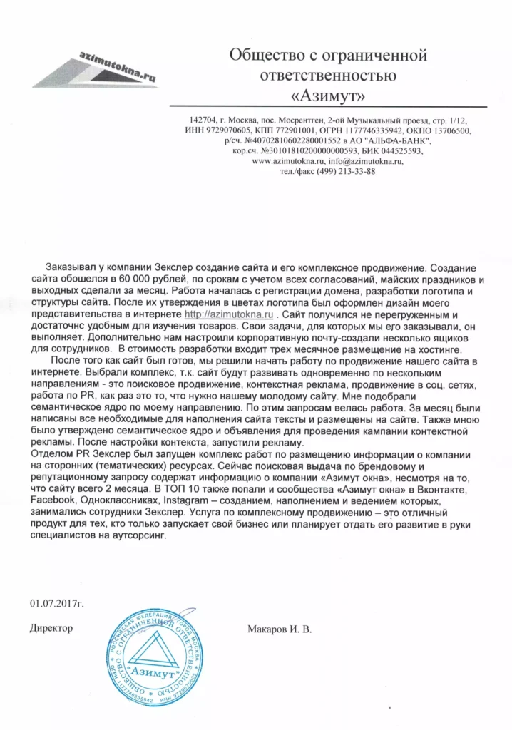 Заказывал у компании Зекслер создание сайта и его комплексное продвижение. Создание сайта обошлось в 60 000 рублей, по срокам, с учетом всех согласований, майских праздников и выходных, сделали за месяц. Работа началась с регистрации домена, разработки логотипа и структуры сайта. После их утверждения в цветах логотипа был оформлен дизайн моего представительства интернете http://azimutokna.ru. Сайт получился не перегруженным и достаточно удобным для изучения товаров. Свои задачи, для которых мы его заказывали, он выполняет. Дополнительно нам настроили корпоративную почту- создали несколько ящиков для сотрудников. В стоимость разработки входит трехмесячное размещение на хостинге.