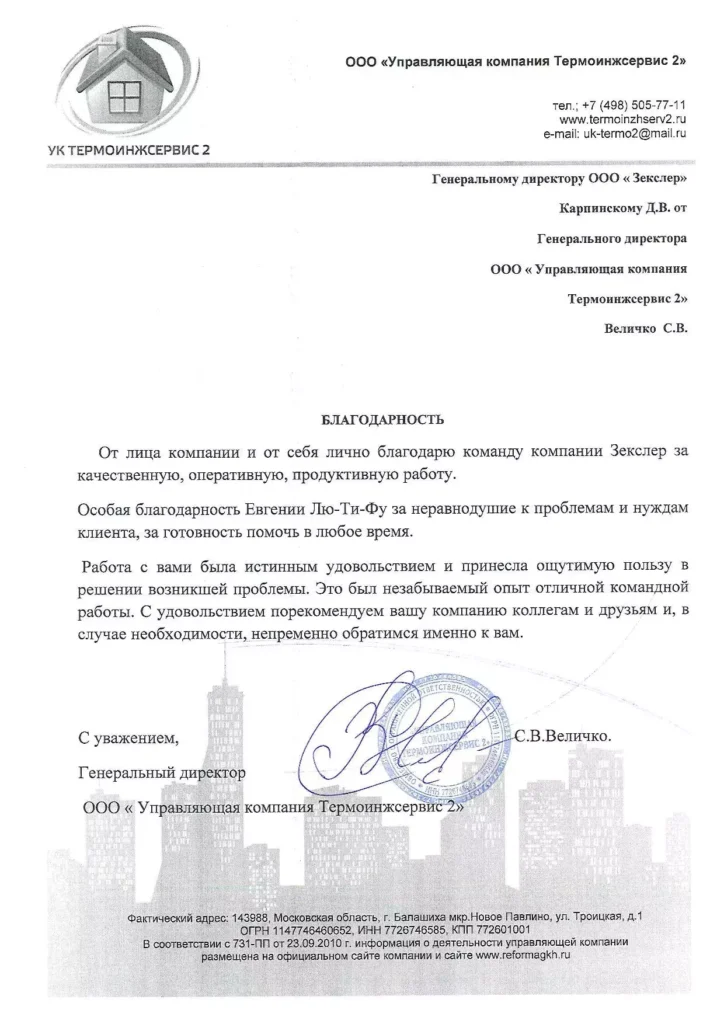 От лица всего коллектива благодарим команду «Зекслер» за качественную, оперативную и профессиональную работу.