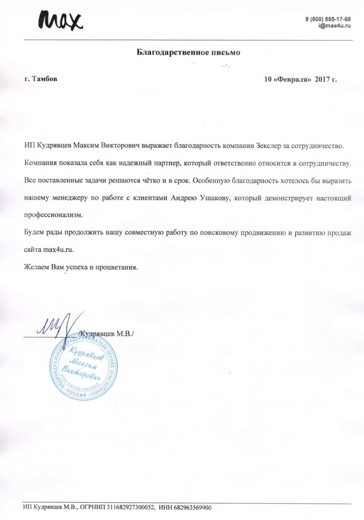 ИП Кудрявцев Максим Викторович выражает благодарность компании Зекслер за сотрудничество. Компания показала себя как надежный партнер, который ответственно относится к сотрудничеству. Все поставленные задачи решаются четко и в срок. Особенную благодарность хотелось бы выразить нашему менеджеру по работе с клиентами Андрею Ушакову, который демонстрирует настоящий профессионализм.