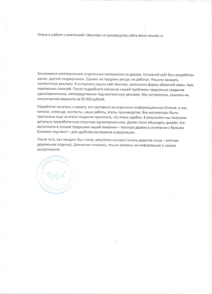 Занимаемся изготовлением отделочных материалов из дерева. Основной сайт был разработан ранее, другим подрядчиком. Однако на продажи ресурс не работал. Решили заказать контекстную рекламу. В интернете нашли сайт Зекслер, заполнили форму обратной связи. Нам перезвонил Алексей. После подробного изучения нашей проблемы предложил создание одностраничника, непосредственно под контекстную рекламу. Мы согласились, сошлись на классическом варианте за 50 000 рублей.