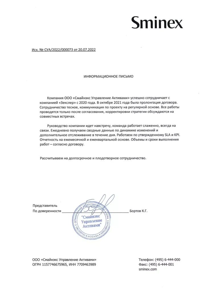 Компания ООО «Смайнэкс Управление Активами» успешно сотрудничает с компанией «Зекслер» с 2020 года. В октябре 2021 года была пролонгация договора. Сотрудничество тесное, коммуникация по проекту на регулярной основе. Все работы проводятся только после согласования, корректировки стратегии обсуждаются на совместных встречах.