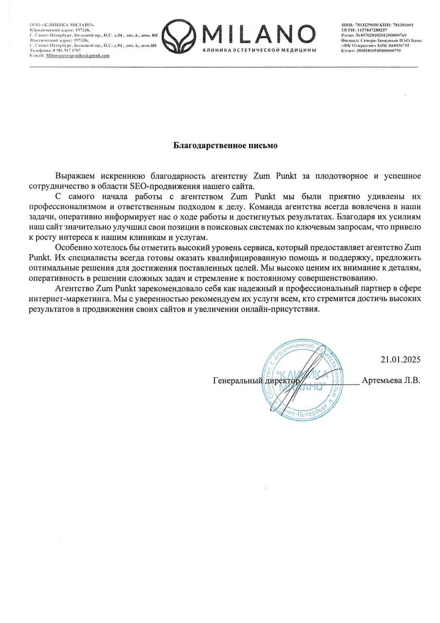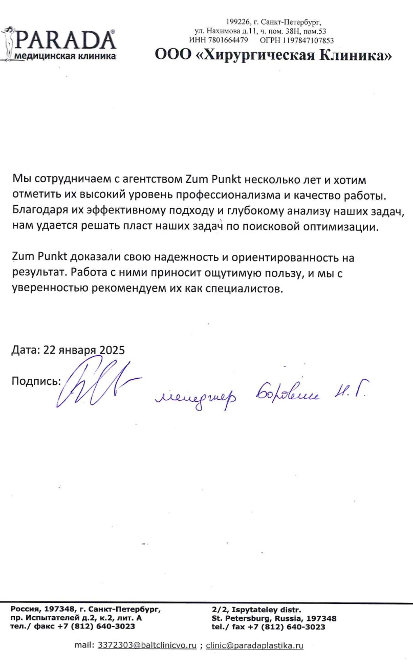 Выражаем искреннюю благодарность агентству Zum Punkt за плодотворное и успешное сотрудничество в сфере SEO-продвижения! С самого начала нашей работы мы были приятно удивлены их профессионализмом и ответственным подходом к делу. Команда всегда вовлечена во все наши задачи, оперативно информирует нас о ходе работы и достигнутых результатах. Благодаря их усилиям наш сайт значительно улучшил позиции в поисковых системах по ключевым запросам, что привело к росту интереса к нашим клиникам и услугам.