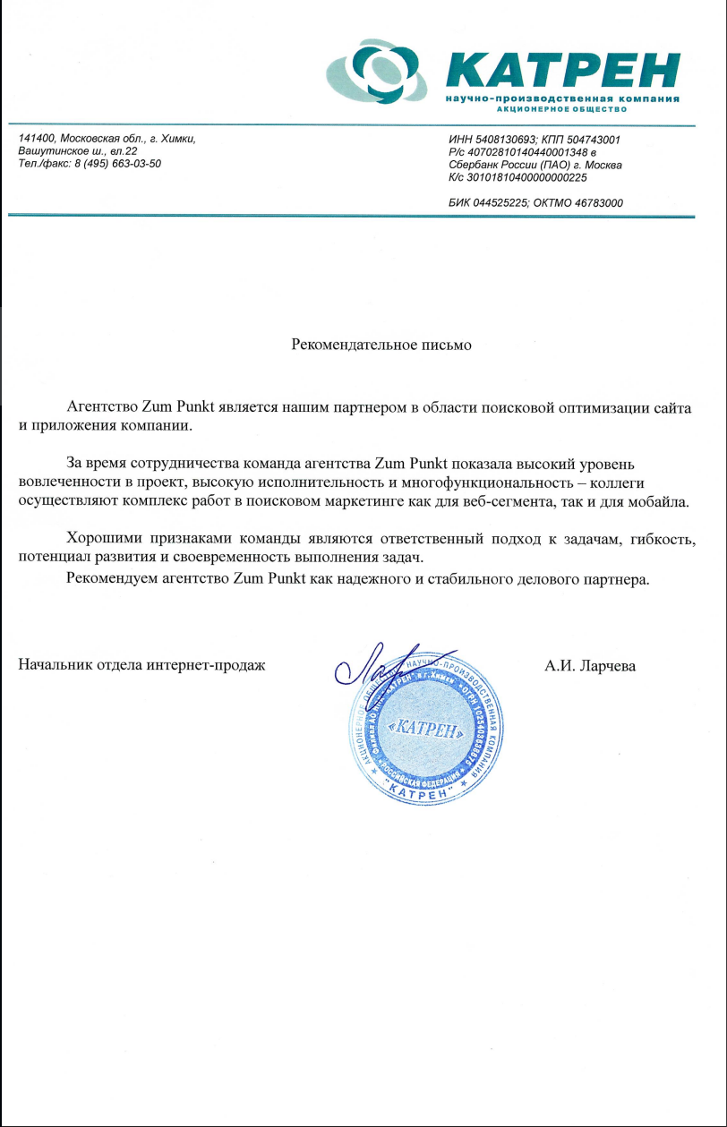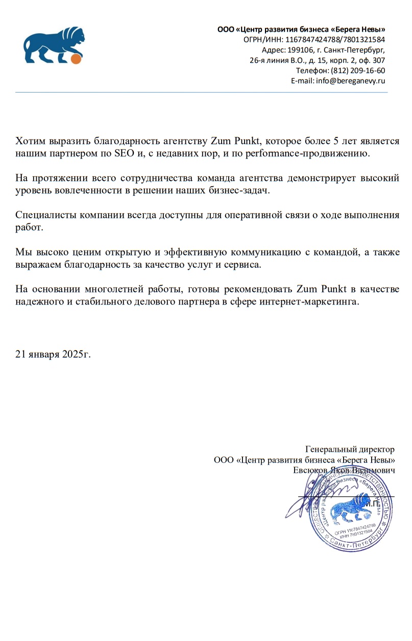выражаем благодарность за качество услуг и сервиса. На основании многолетней работы, готовы рекомендовать Zum Punkt в качестве надежного и стабильного делового партнера в сфере интернет-маркетинга.