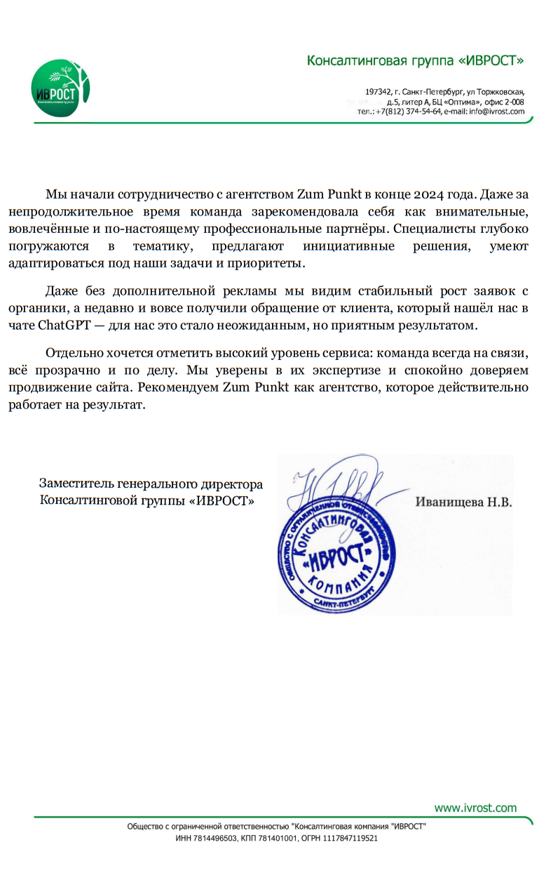 Мы сотрудничаем с агентством Zum Punkt не первый год и хотим отметить их высокий уровень профессионализма и качество работы. Благодаря их эффективному подходу и глубокому анализу наших задач, нам удается решать пласт наших задач по поисковой оптимизации.