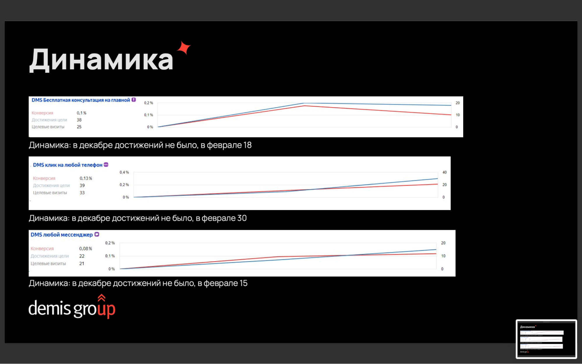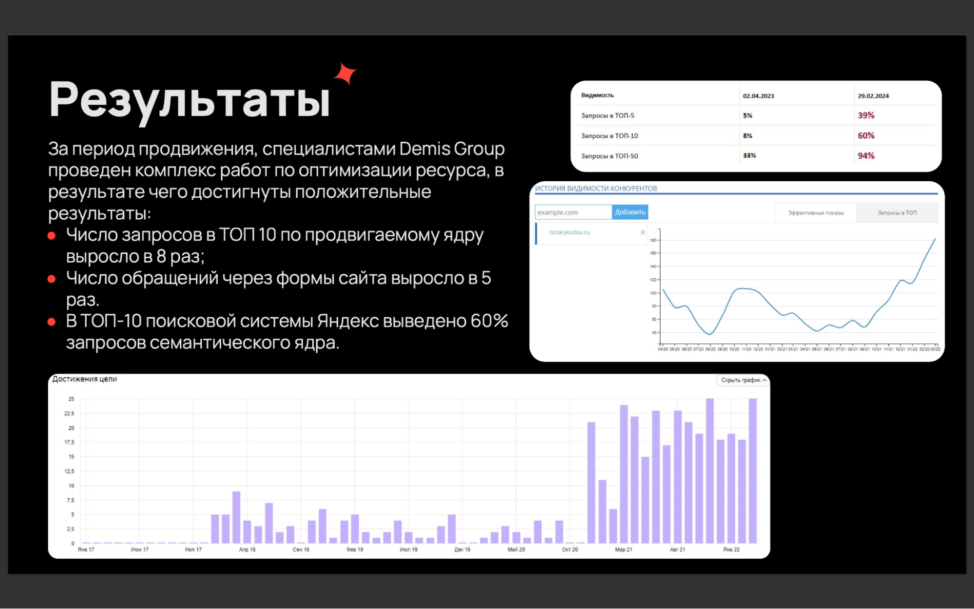 Пример работы показывает: доверие пользователя — ключевой драйвер эффективности сайта. Так, в Demis Group обратилась нотариальная компания с целью повысить видимость сайта и увеличить количество обращений.