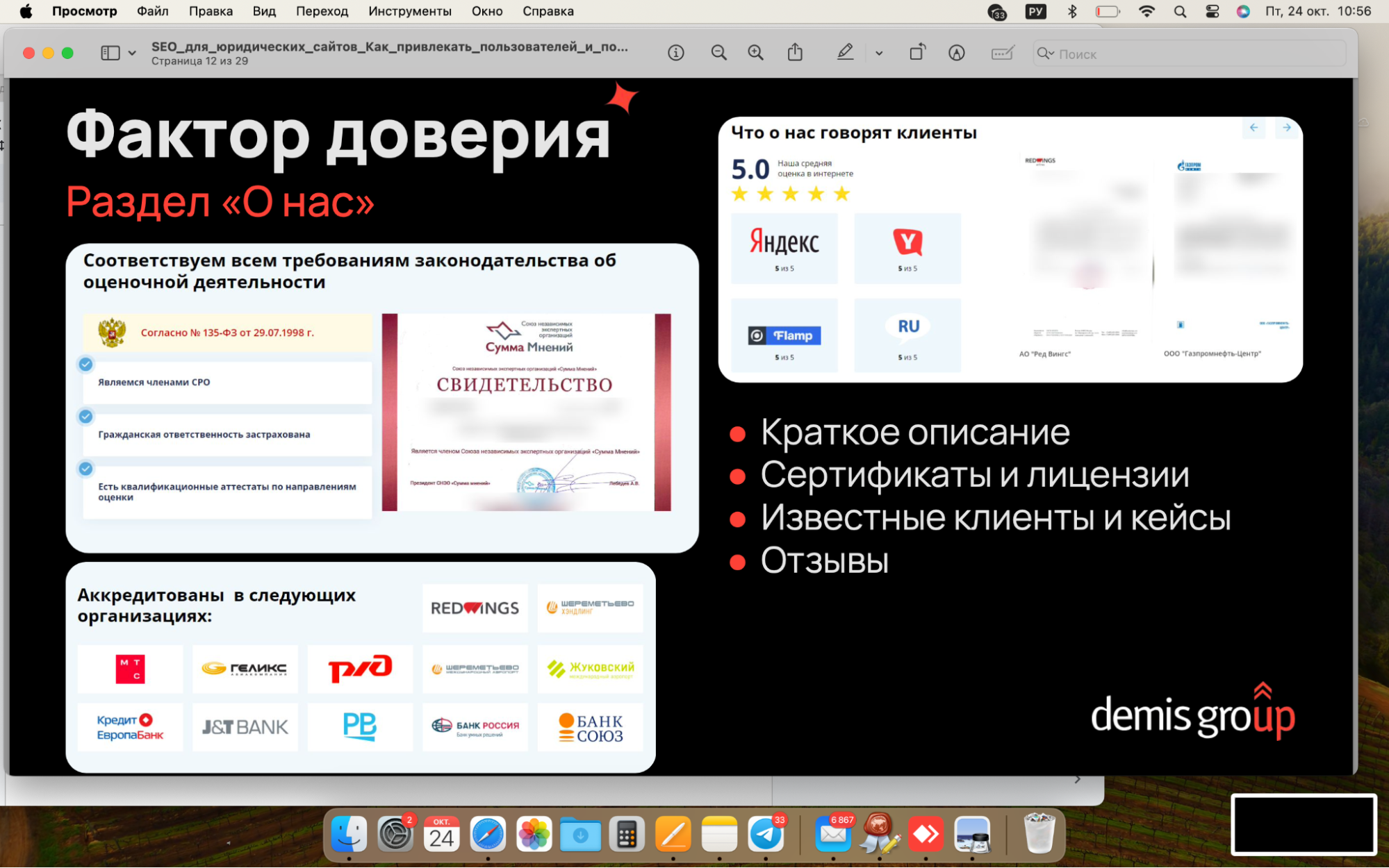 - Лицензии, сертификаты, партнёрства, благодарственные письма.