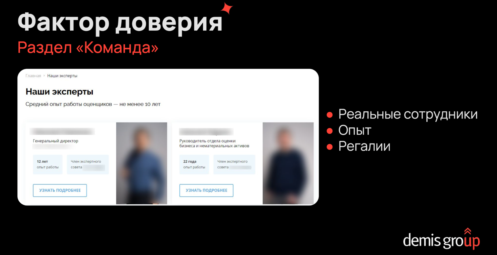 - Карточки сотрудников с фото, опытом, специализацией и значимыми кейсами.