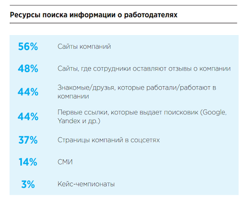 Исследование iConText Group в сфере интернет-маркетинга показало, что HR-бренд работодателя значим почти для 40% сотрудников. В 2019 году компания Hays изучила важность HR-бренда для поколения Z и выяснила, что 48% опрошенных собираются ознакомиться с отзывами о работодателе перед принятием решения о трудоустройстве, а 44% предпочитают переходить по первым ссылкам в выдаче.