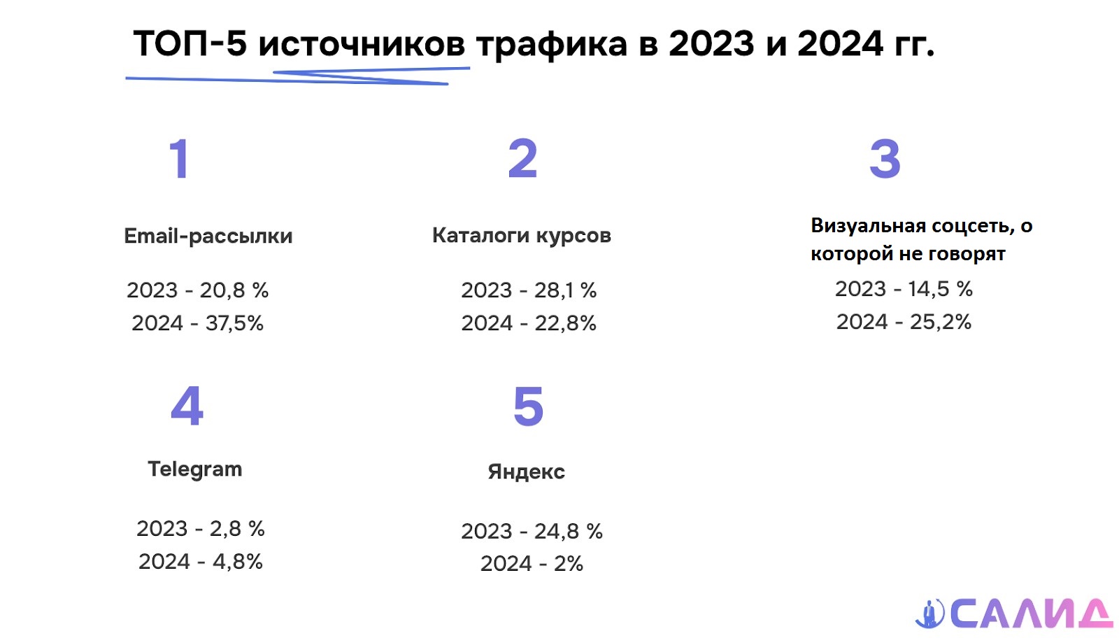 2024 год ознаменовался сменой лидеров среди каналов привлечения. Несмотря на исторически сложившуюся популярность email-маркетинга и каталогов, сотрудничество с владельцами тематических каналов и блогерами вышло на первый план благодаря более персонализированному взаимодействию с аудиторией и возможности получать мгновенную обратную связь. Яндекс.Директ, напротив, утратил позиции как основной инструмент продвижения образовательных продуктов.
