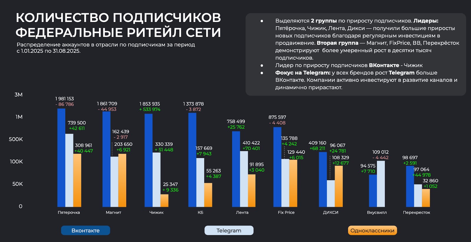 - «Телеграм» является доминирующим каналом продвижения для продовольственных ритейлеров, опережая «Вконтакте» по эффективности.