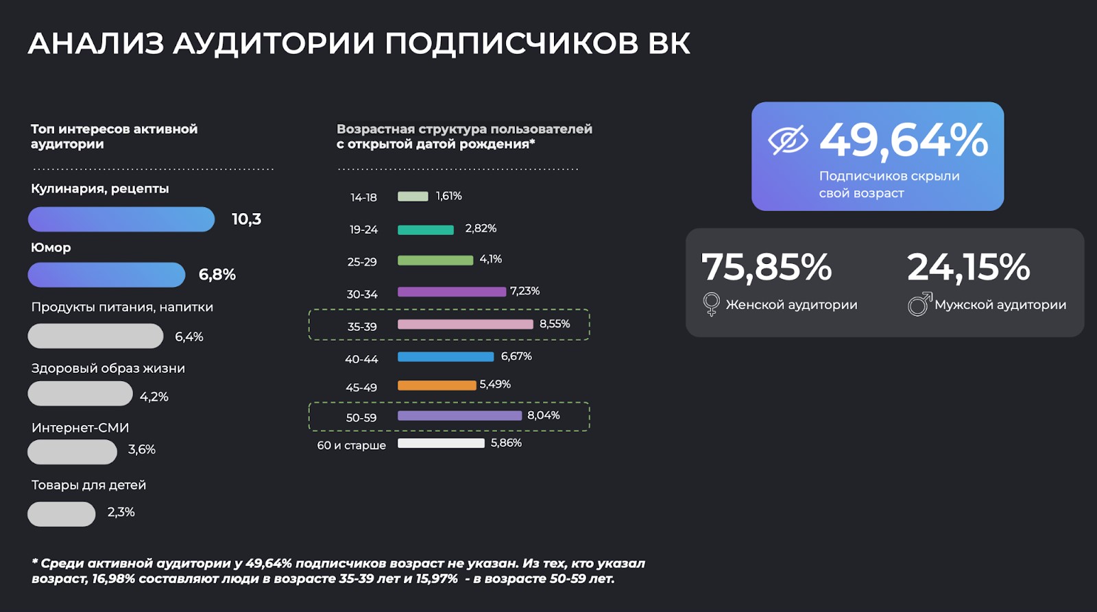 В исследовании проанализированы прирост аудитории, вовлеченность, топ интересов активных пользователей и демографические характеристики аудитории.