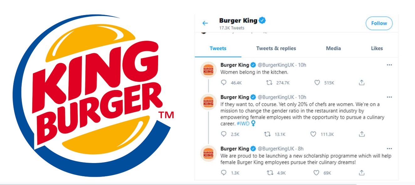 Яркий пример из практики — британская twitter-кампания Burger King в 2021 году, приуроченная к 8 Марта. Первый твит звучал провокационно: «Место женщины — на кухне». Следом появилось уточнение, что только с их согласия, и затем анонс стипендий для женщин в области кулинарии. Цель кампании — привлечь внимание к проблеме гендерного равенства и поддержать женщин в профессии.