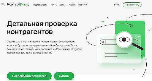 | 3 | Контур. Фокус | Сервис проверяет компании по официальным источникам, определяет угрозы в виде банкротства, неплатежеспособности, долгов, судов. | Проверка иностранных контрагентов. Выездная проверка офиса и других объектов. Проверка физических лиц. Аналитика связанных организаций. Помощь экспертов. | 22000 -61500 руб. в год Разовый – 1300 руб. |