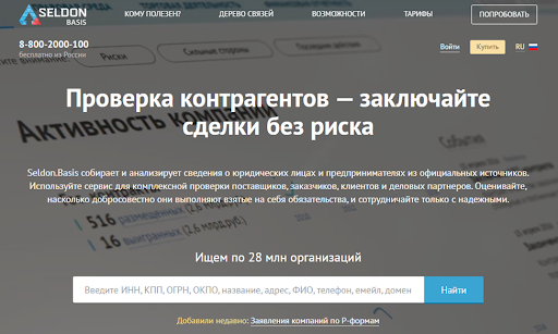 | 5 | Seldon.Basis | Проверка по официальным источникам. Поиск в списках банкротов, недобросовестных поставщиков. Сведения по арбитражу, финансам, госконтрактам. | Сегментация рынка, создание базы клиентов с актуальными контактами. Выявление безнадежных долгов и уклонения от уплаты налогов. Отслеживание информации в СМИ. Индекс благонадежности | На сутки – 990 руб., на неделю -2990 руб., на месяц -7990 руб., на год -69000 руб. |