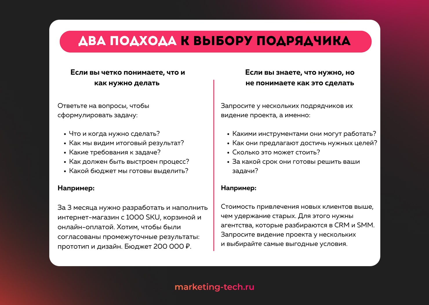 - Расскажите нам, под какую задачу вам нужен подрядчик.