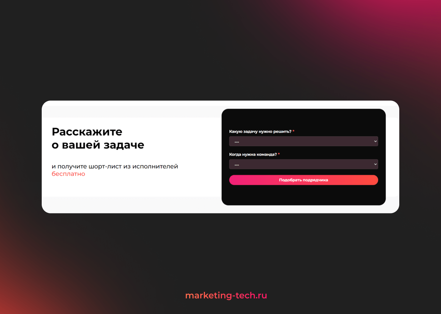 Для получения бесплатного шорт-листа проверенных исполнителей для digital-задач любой сложности достаточно на платформе MARKETING-TECH и ответить на несколько вопросов.