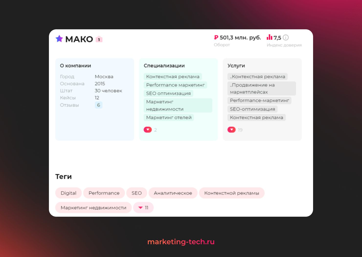Для решения этой проблемы каталог агентств MARKETING-TECH разработал специализированный сервис подбора исполнителей под сложные цифровые запросы. Его принцип работы будет рассмотрен на конкретных примерах.