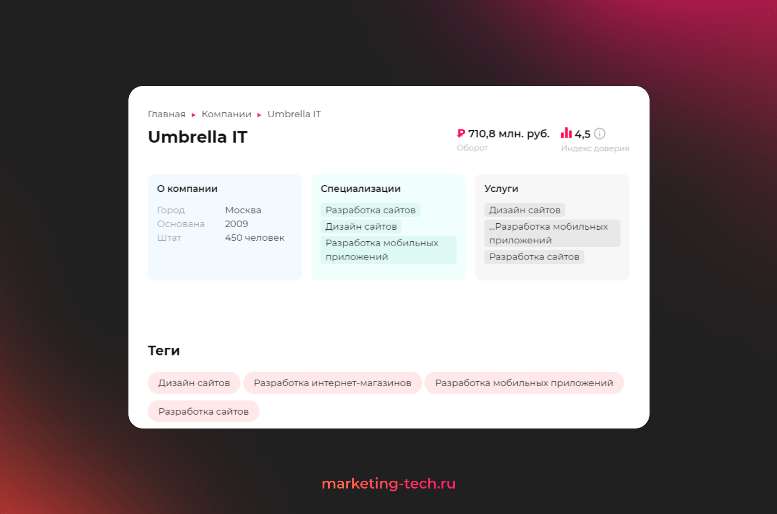 Карточки агентств в каталоге содержат детальную информацию, которая обычно остаётся недоступной: данные о количестве сотрудников, годовом обороте и релевантные кейсы. Это позволяет составить комплексное представление о потенциальном подрядчике еще на этапе принятия решения.