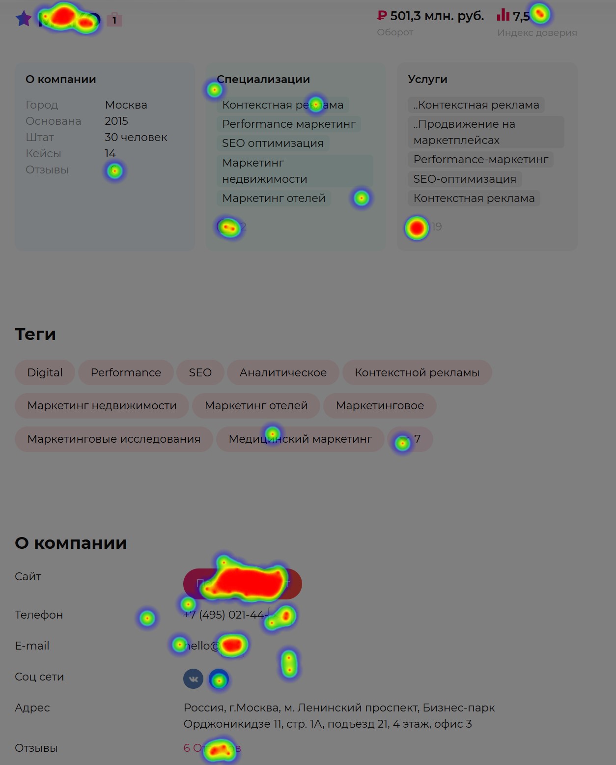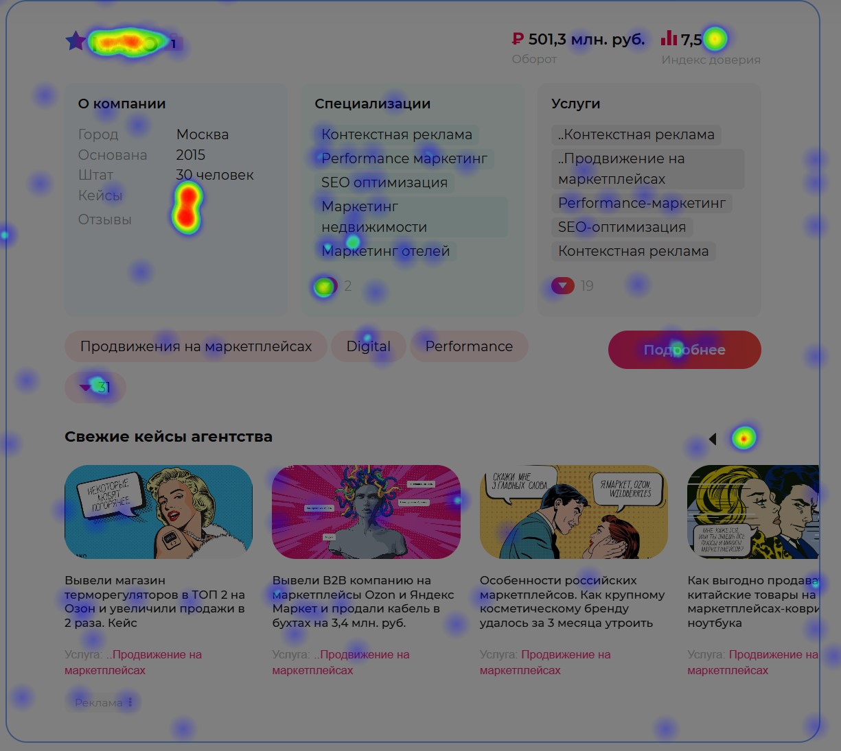 Поведение пользователей сконцентрировано не только на целевых кнопках (Название агентства и «Подробнее»). Большинство заказчиков активно изучают кейсы агентств и отзывы о них, а также обращают внимание на «Индекс доверия» — это комплекс факторов, которые помогают завоевать доверие и принять решение при выборе подрядчика.