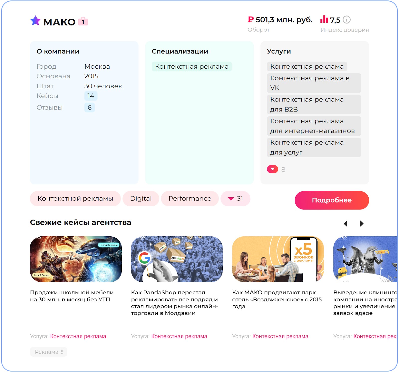 В карточке агентства отражены все направления работы, даже те, которых может не быть на сайте. Это важно, потому что заказчики часто ищут подрядчиков по смежным задачам и сразу видят, чем ещё может быть полезна компания.