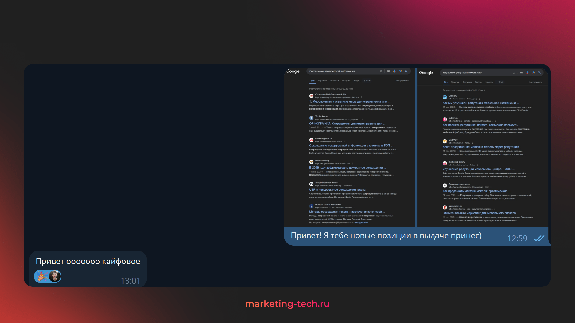 Команда платформы постоянно взаимодействует с клиентами, оперативно сообщая о достижениях. Например, агентство регулярно получало уведомления о выходе на топ-1 в поисковой выдаче по ключевым запросам.