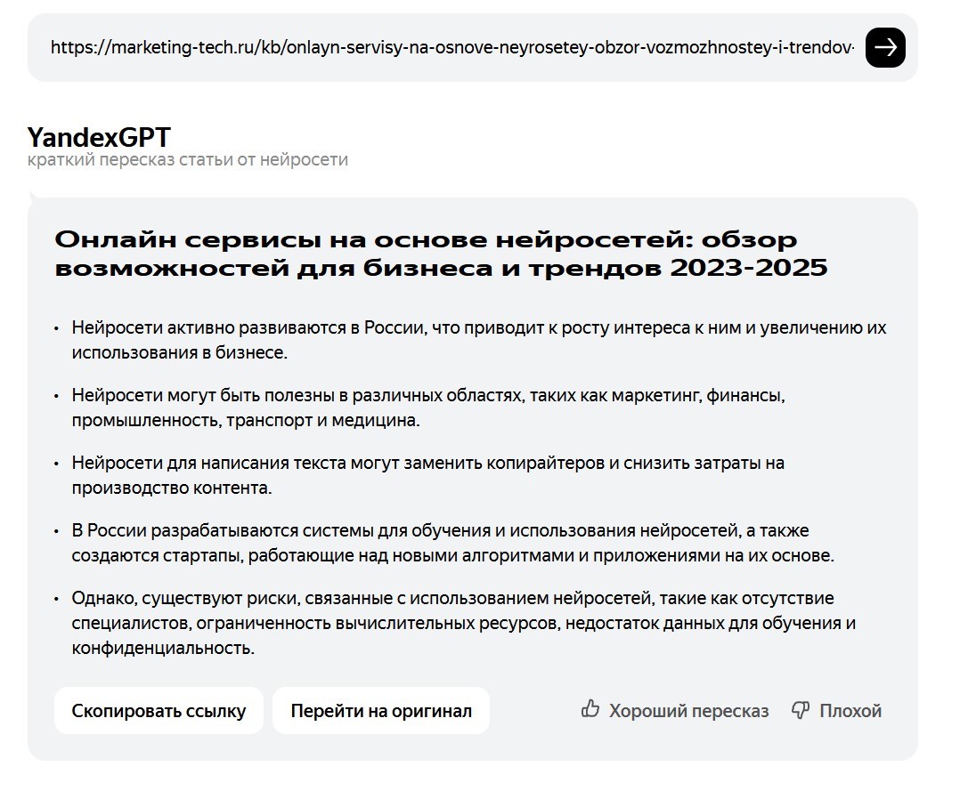 А что у нас? Отечественный аналог ChatGPT – YandexGPT, способен тезисно изложить смыслы, заложенные в любой статье и коротко пересказать любой материал. Мы подали ему на вход один из материалов базы знаний на Маркетинг Tech. И вот что получилось: