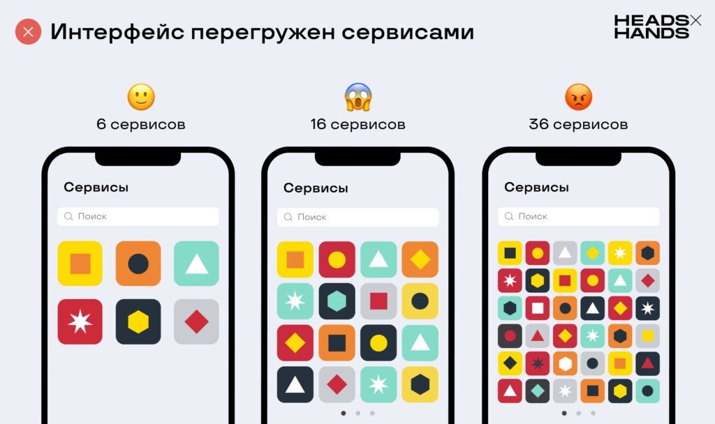 - В интерфейсе супераппа слишком много сервисов. Он перегружен. Однотипные ярлыки с приложениями на все случаи жизни затрудняют поиск нужного сервиса и отнимают время. Человеку приходится запоминать, в каком именно месте находится нужная иконка.