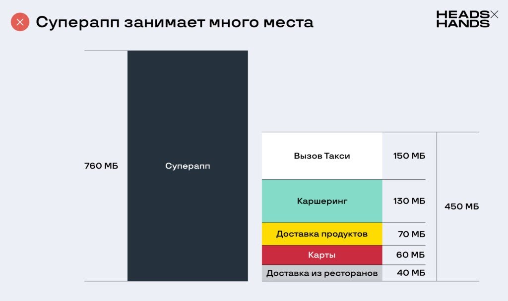 6. Супераппу нужно слишком много места в памяти телефона. Например, супер приложение, решающее проблему городской мобильности, весит 760 Мб, а суммарное место в памяти всех пяти миниаппов в его составе – 450Мб. Когда пользователю не будет хватать места на смартфоне, он сотрет суперапп и установит только нужные приложения. Это поможет сэкономить память в несколько раз.