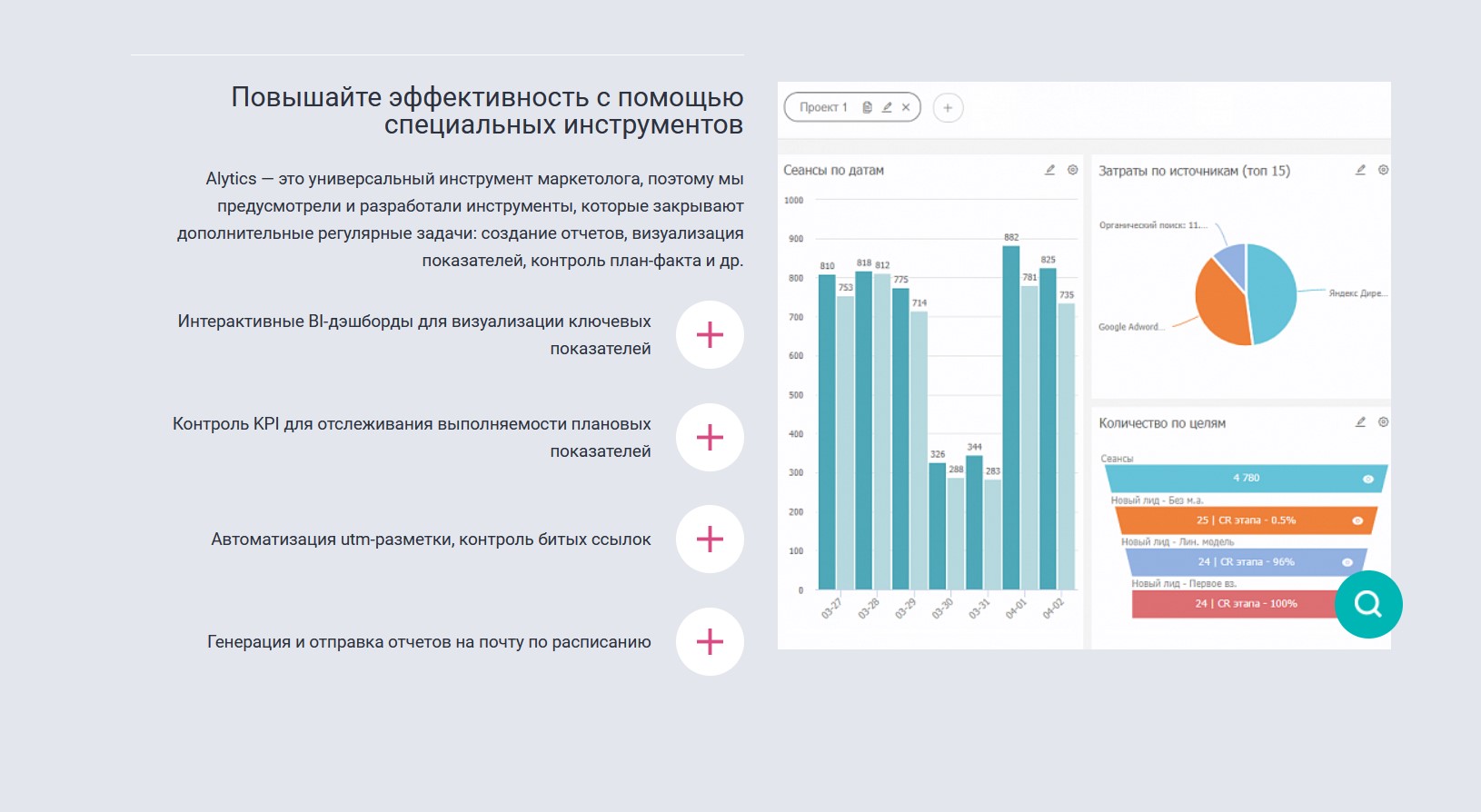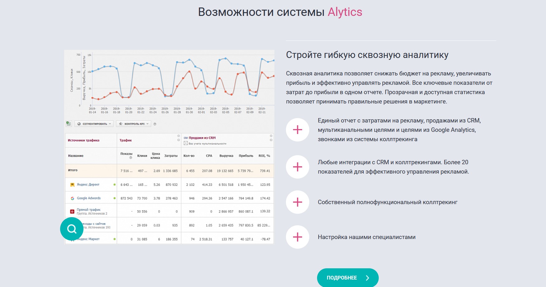 Платформа Alytics помогает оптимизировать бюджет на контекстную рекламу, чтобы увеличить продажи с помощью контента и автоматизировать рутинную работу, чтобы сэкономить время. Точный коллтрекинг и аналитика помогут привлечь больше клиентов. Подключение сервиса производят специалисты. Для агентств предлагается сертификация.