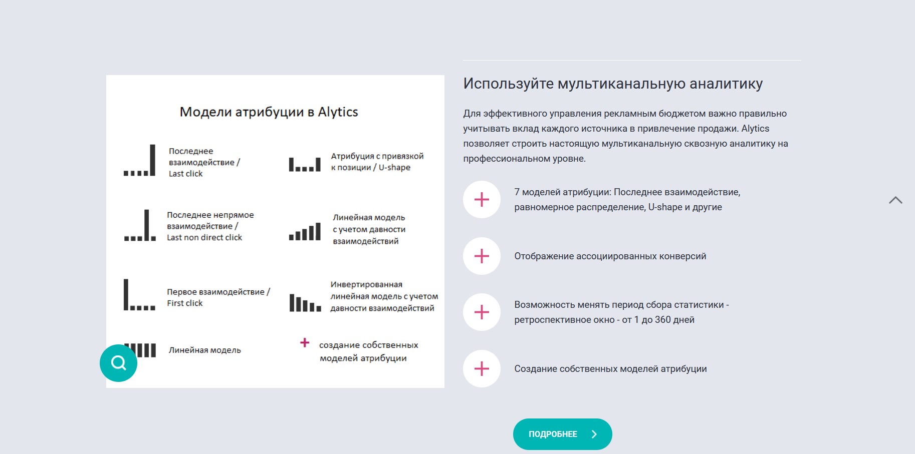 - 7 моделей атрибуции и 20 показателей эффективности размещения рекламы.