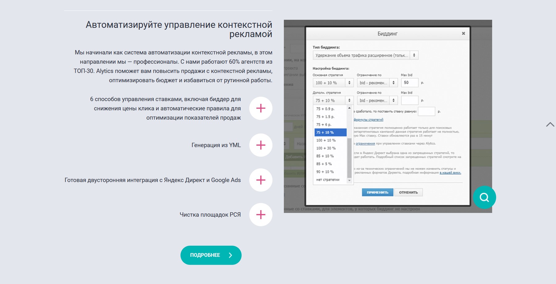 - Автоматизация и аналитика контекстной рекламы, контроль ставок.