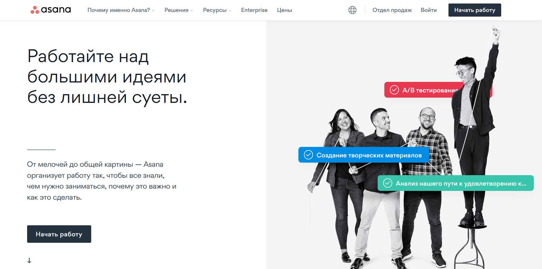 Asana – это сервис для совместной работы над проектами, задачами, обмена документацией и чек-листами. Asana дает командам возможность делать повседневные дела с повышенной эффективностью: с помощью инструментов для совместной работы и управления проектами команды могут организовывать запуск продуктов, маркетинговые кампании и управлять ими. Каждая задача будет идти по плану с четким указанием владельца, подзадач, сроков выполнения и комментариев.