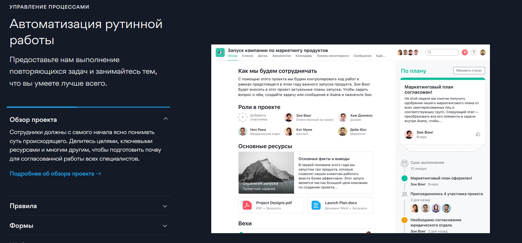 Asana помогает организовать все работы в одном месте, что повышает продуктивность команды. В настоящее время Asana используется более чем 90 000 организаций по всему миру, связывает стратегические цели с практическими рабочими процессами и помогает внести ясность в планы, процессы и обязанности.