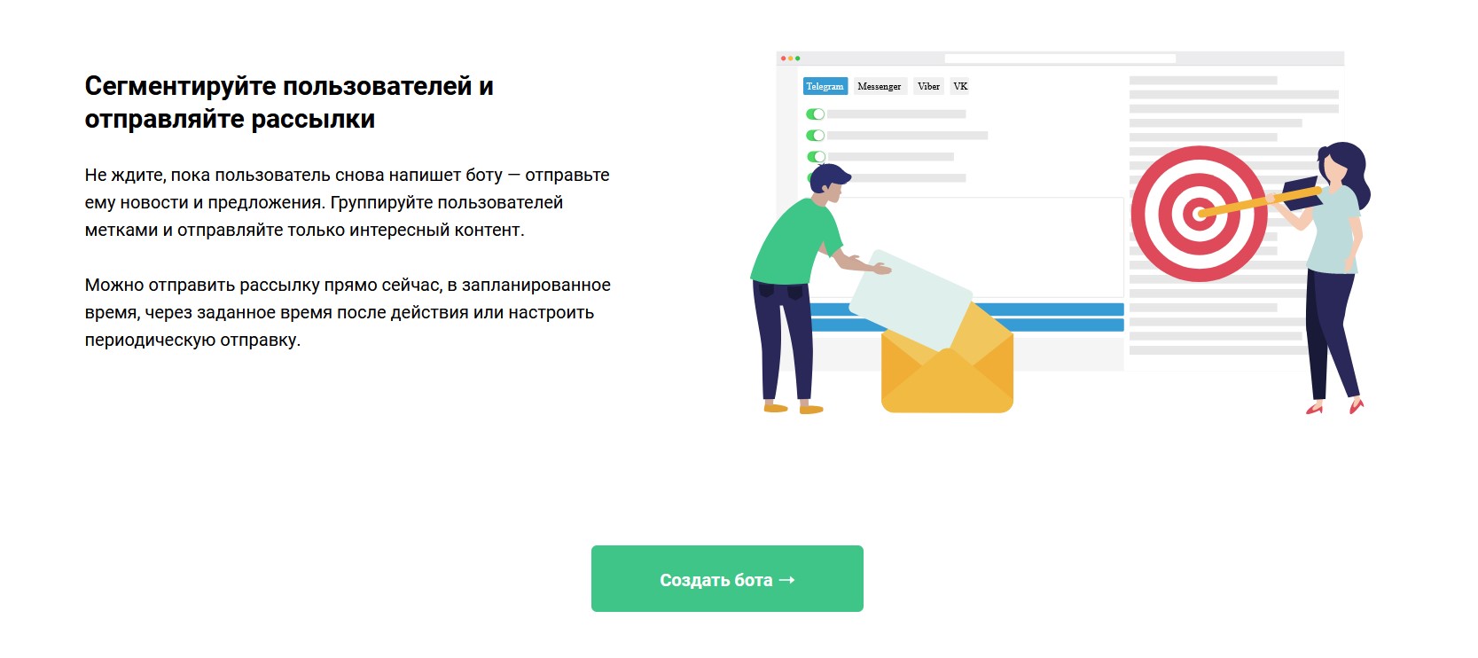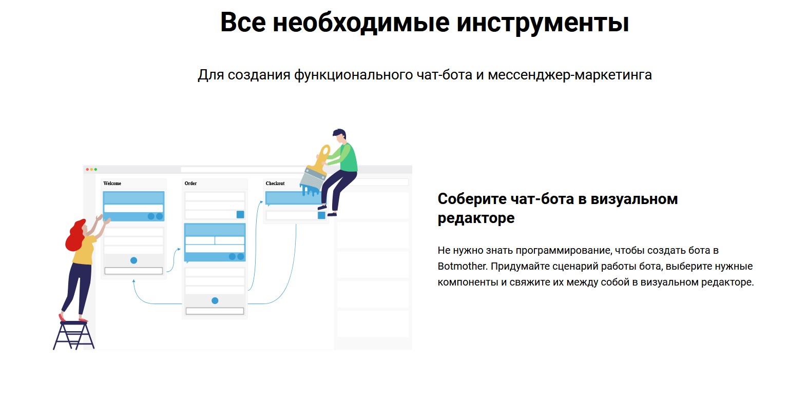 - Создание бота из готовых блоков в мессенджерах с последующим редактированием.