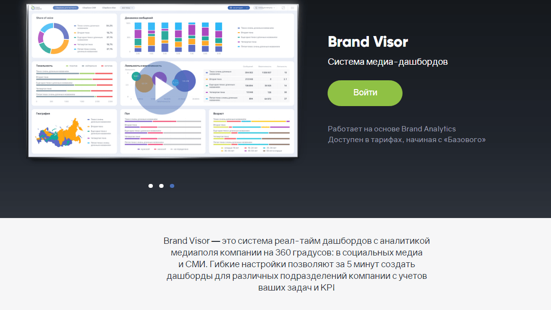 - Продукт Brand Visor – это система дашбордов в реальном времени с 360-градусной аналитикой медиа-поля компании: в соцсетях и СМИ. Гибкие настройки позволяют создавать дашборды для разных отделов компании за 5 минут.