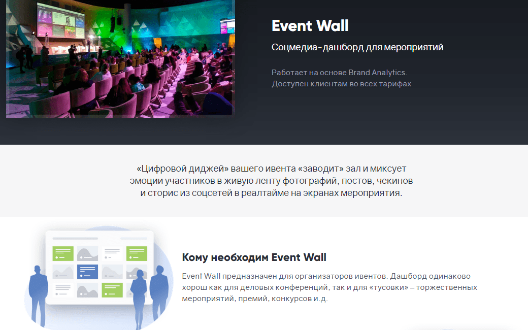 - Продукт Event Wall предназначен для организаторов мероприятий. Подходит как для бизнес-конференций, так и для «светских мероприятий», то есть торжественных мероприятий, награждений, конкурсов. Позволяет в реальном времени отслеживать реакции участников.