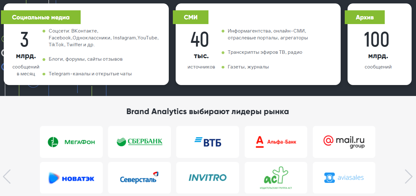 - Мониторинг и анализ 3 мрд. сообщений в мес. в социальных медиа, 55 тыс. источников в онлайн и офлайн СМИ. И доступ к 190 млрд. архивных сообщений из соцмедиа с 2012 года.