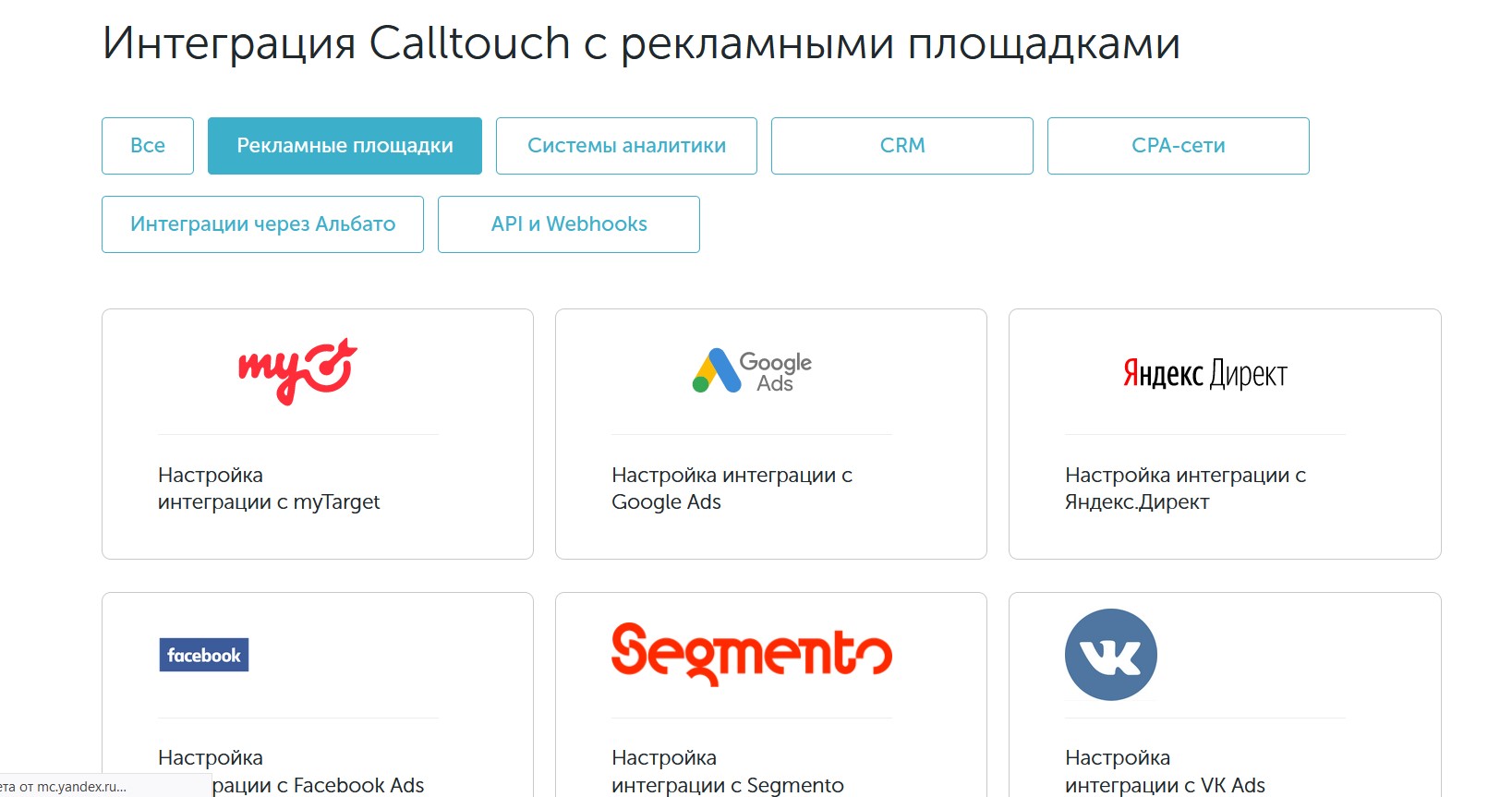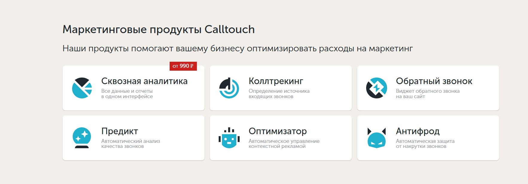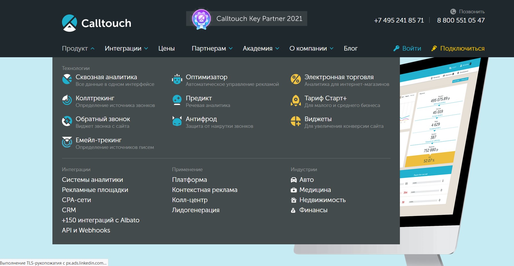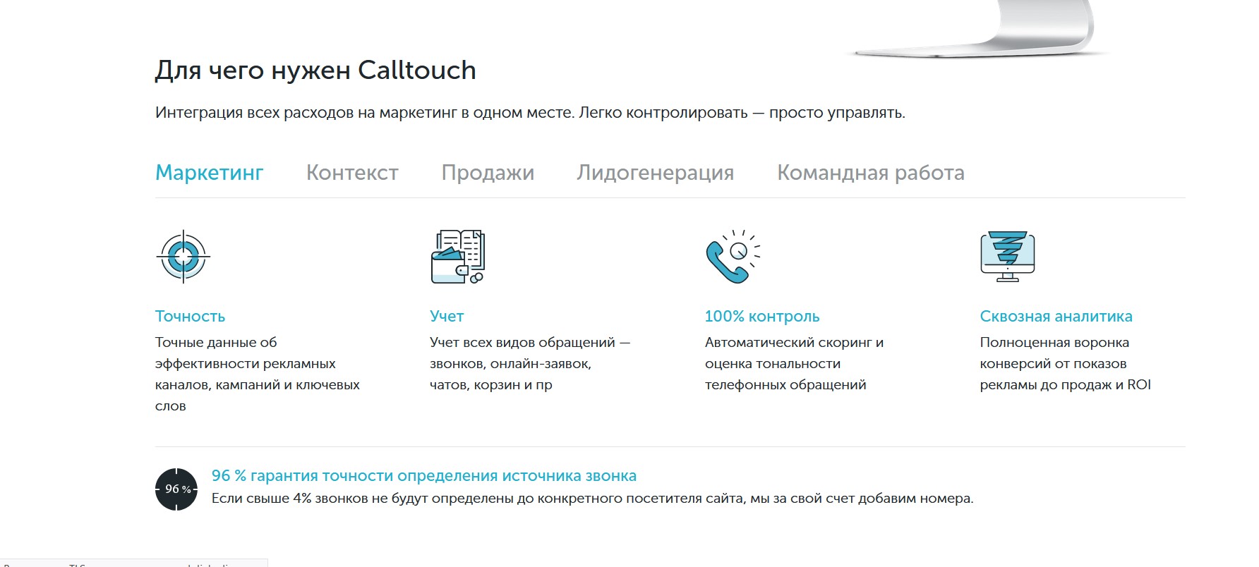 Calltouch – сервис коллтрекинга и комплексной сквозной аналитики с высокой точностью определения источника звонка – 96%. С помощью сквозной аналитики помогает учитывать все расходы на маркетинг, отслеживать выполнение KPI. Сервис предоставляет дополнительные функции: автоматизация контекстной рекламы, трекинг писем, антифрод, виджеты для сайта. Calltouch интегрируется с другими рекламными платформами, системами аналитики, CRM, сетями CPA, имеет открытый API.