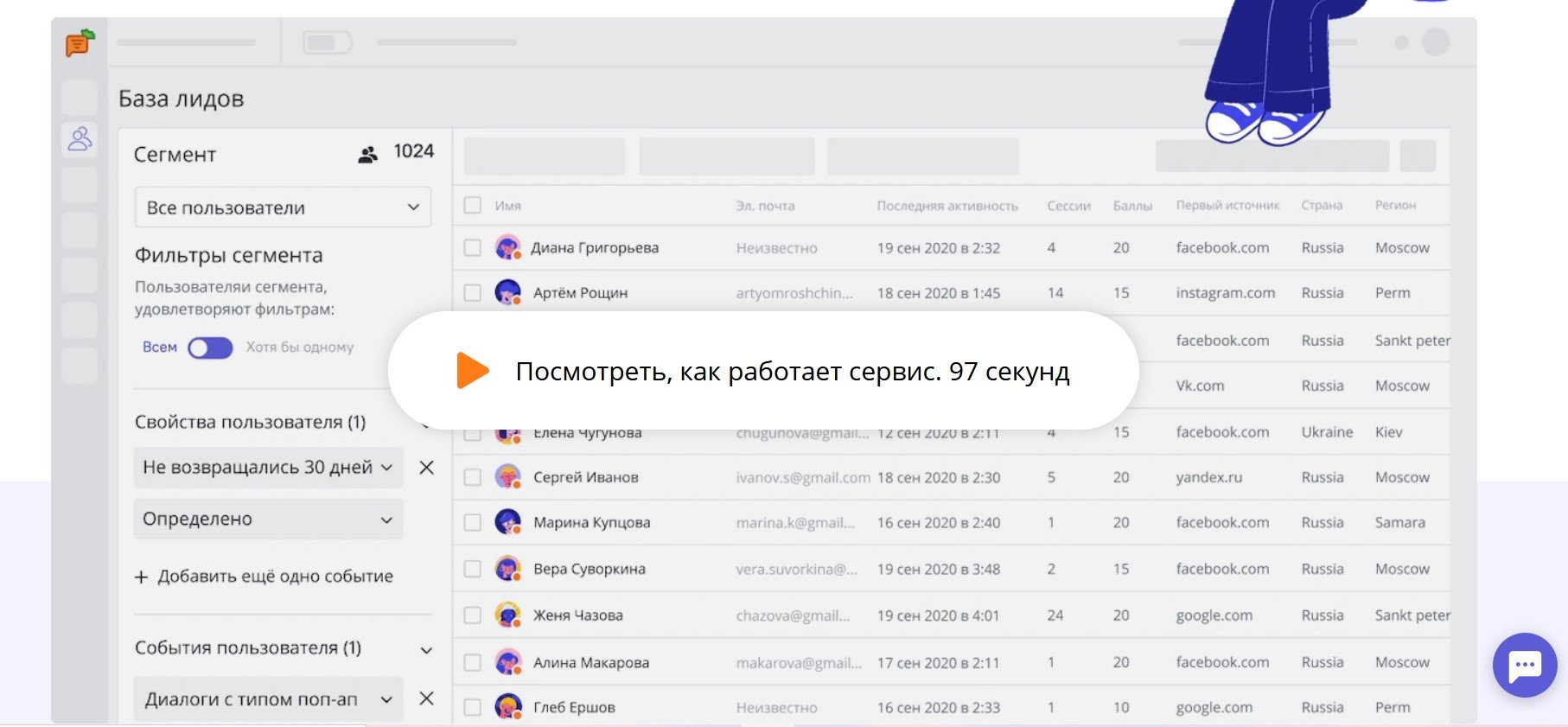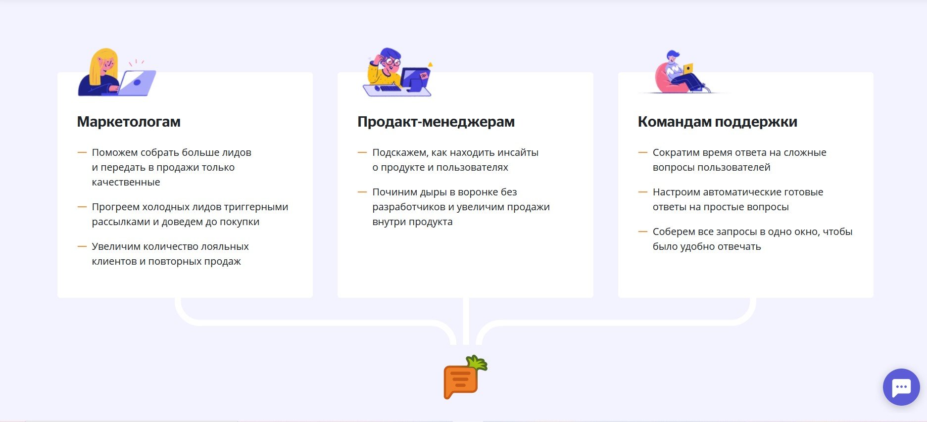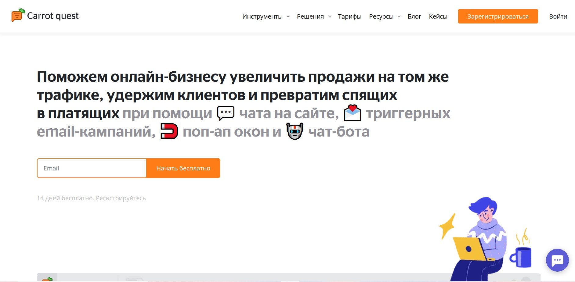 Carrot quest преобразует посещения веб-сайта в продажи, поможет удержать клиентов и повторно активировать неактивных пользователей с помощью чата, целевых почтовых кампаний, всплывающих окон и чат-бота.