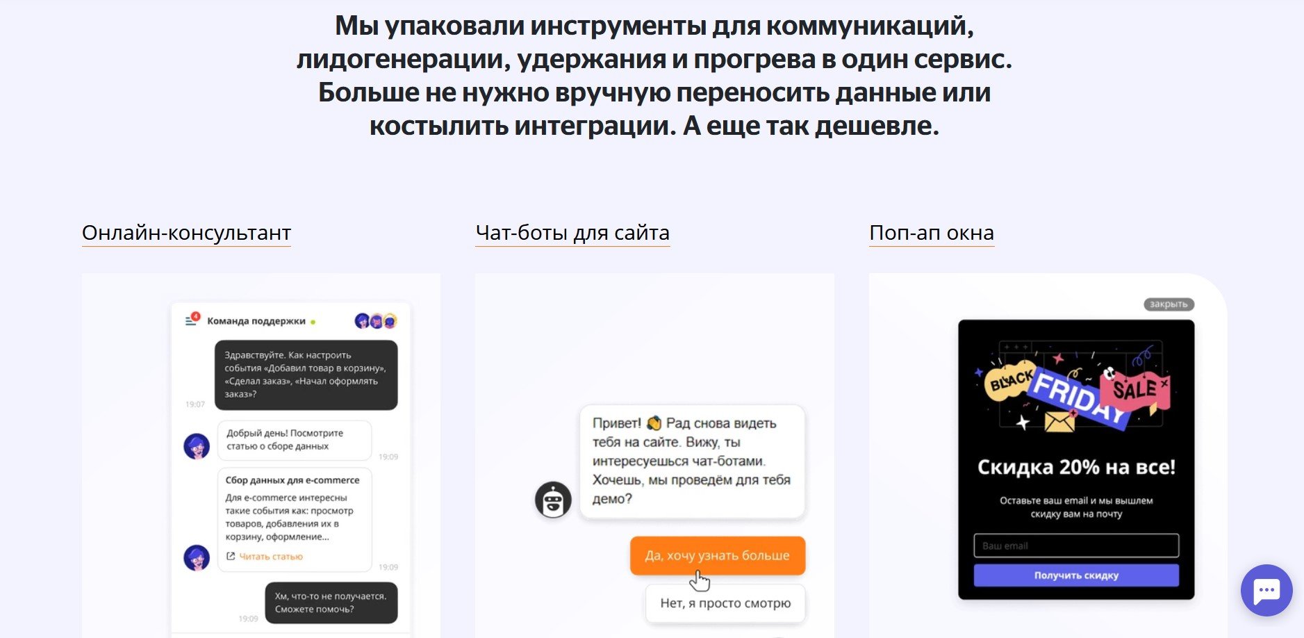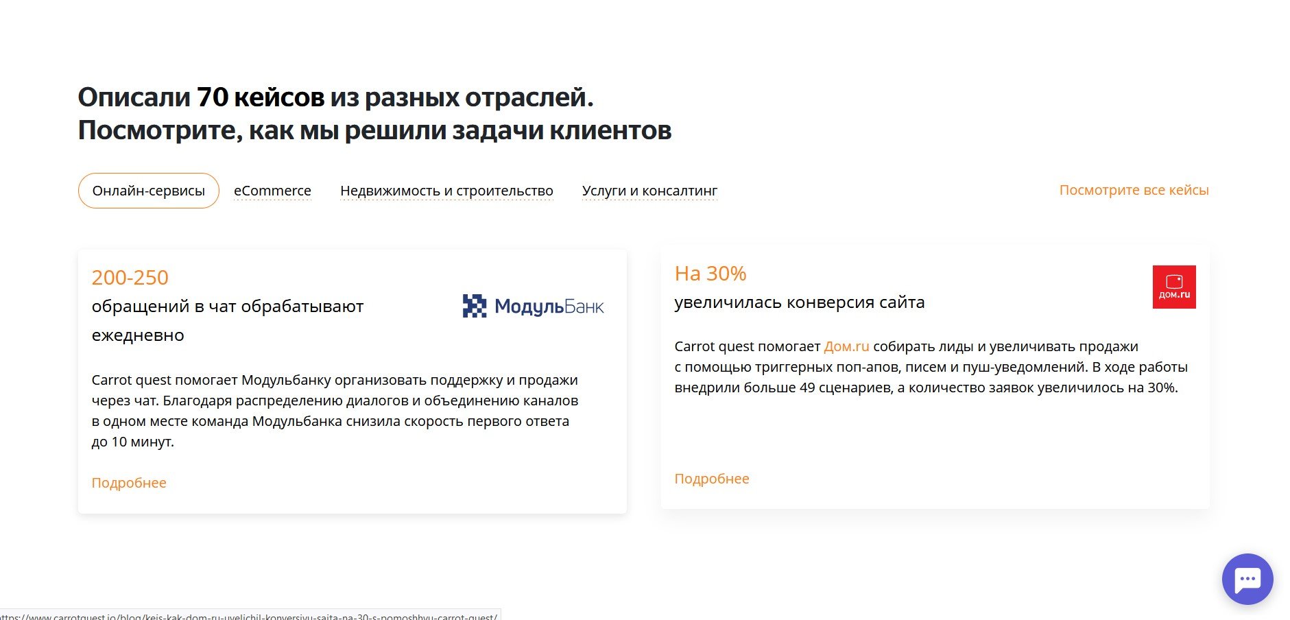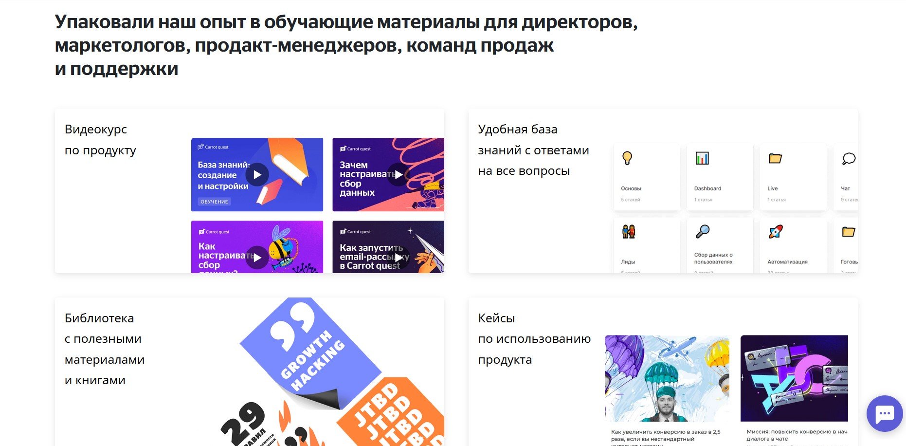 Carrot quest привлекает посетителей, удерживает и возвращает их на сайт или в магазин. Автоматизация маркетинга способствует лидогенерации и росту продаж. Для пользователей есть видеотур по сервису, вебинары и кейсы, обучающие настройкам сервиса на сайте.