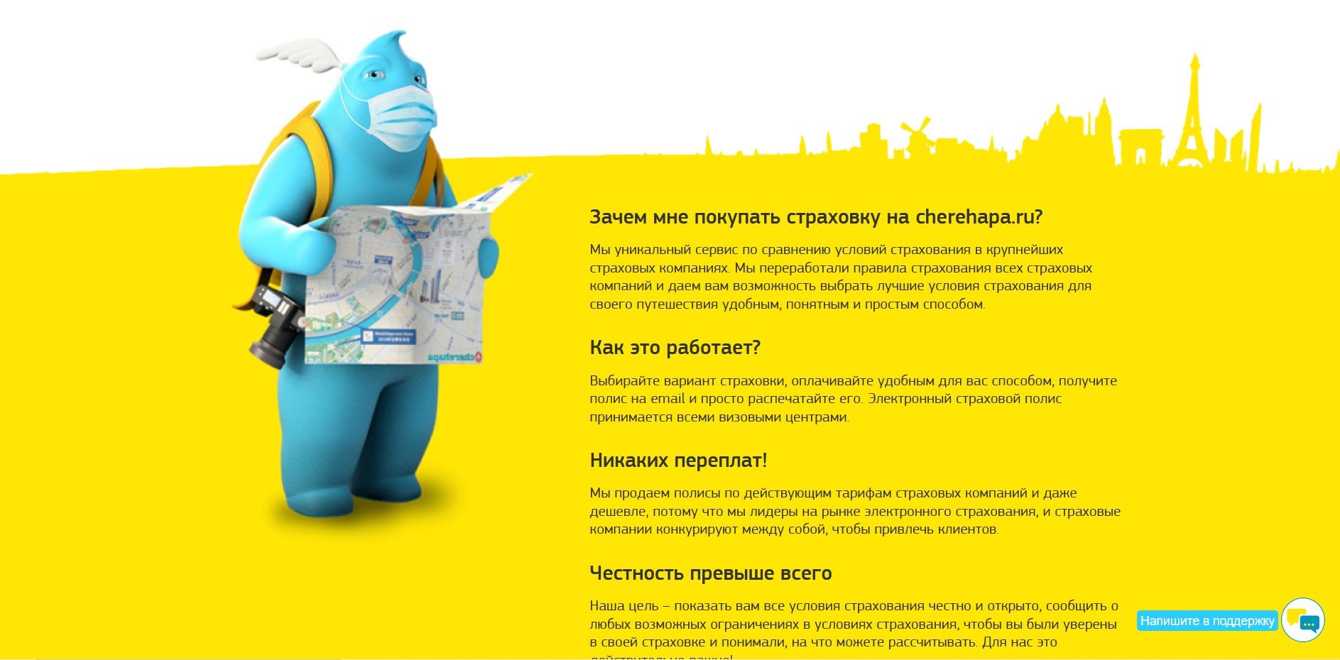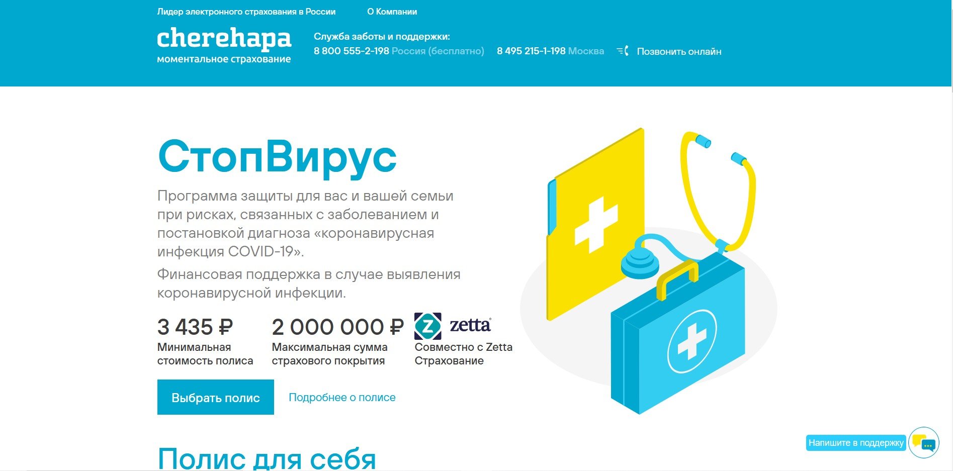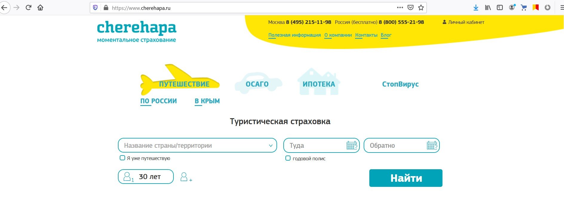 Черехапа – быстрый сервис сравнения и покупки онлайн полисов ОСАГО, туристической и ипотечной страховки. Клиент может купить программу страхования риска, связанного с COVID ‑ 19. Онлайн – сервис работает с ведущими страховыми компаниями и отличается высокой оперативностью. Кроме того, на сайте размещена полезная информация об услугах и особенностях страхования.
